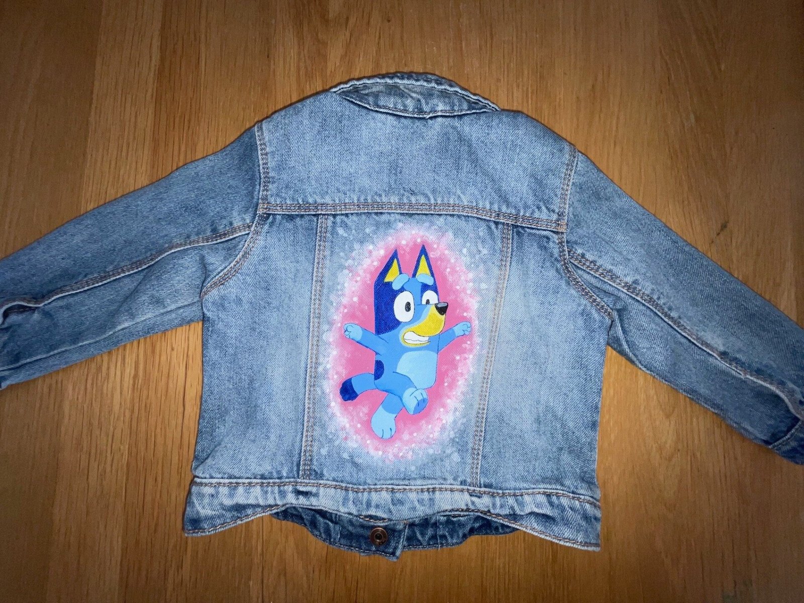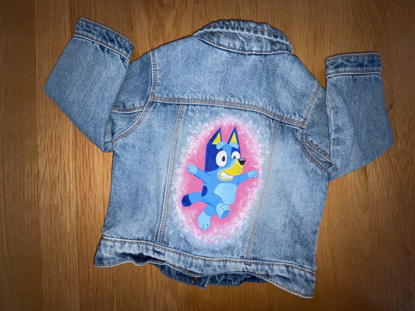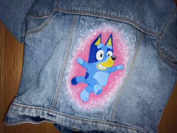 The hand-painted back panel features an illustration of Bluey in total dance mode, with a fun pink background!