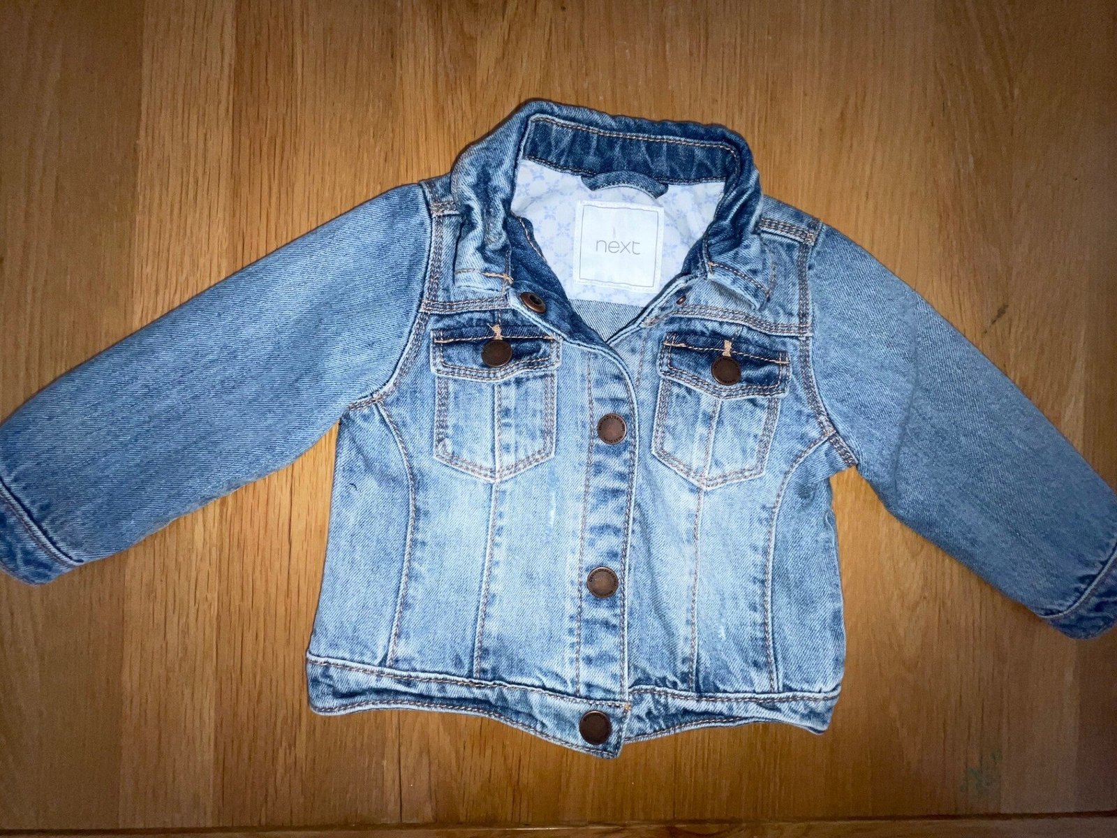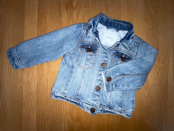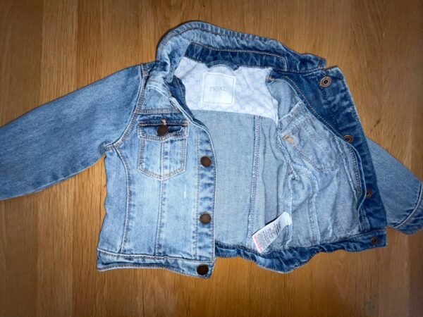 Discover the perfect blend of style and sustainability with this upcycled Next denim jacket designed for age 9-12 months. This unique piece will allow your child to make a bold fashion statement!